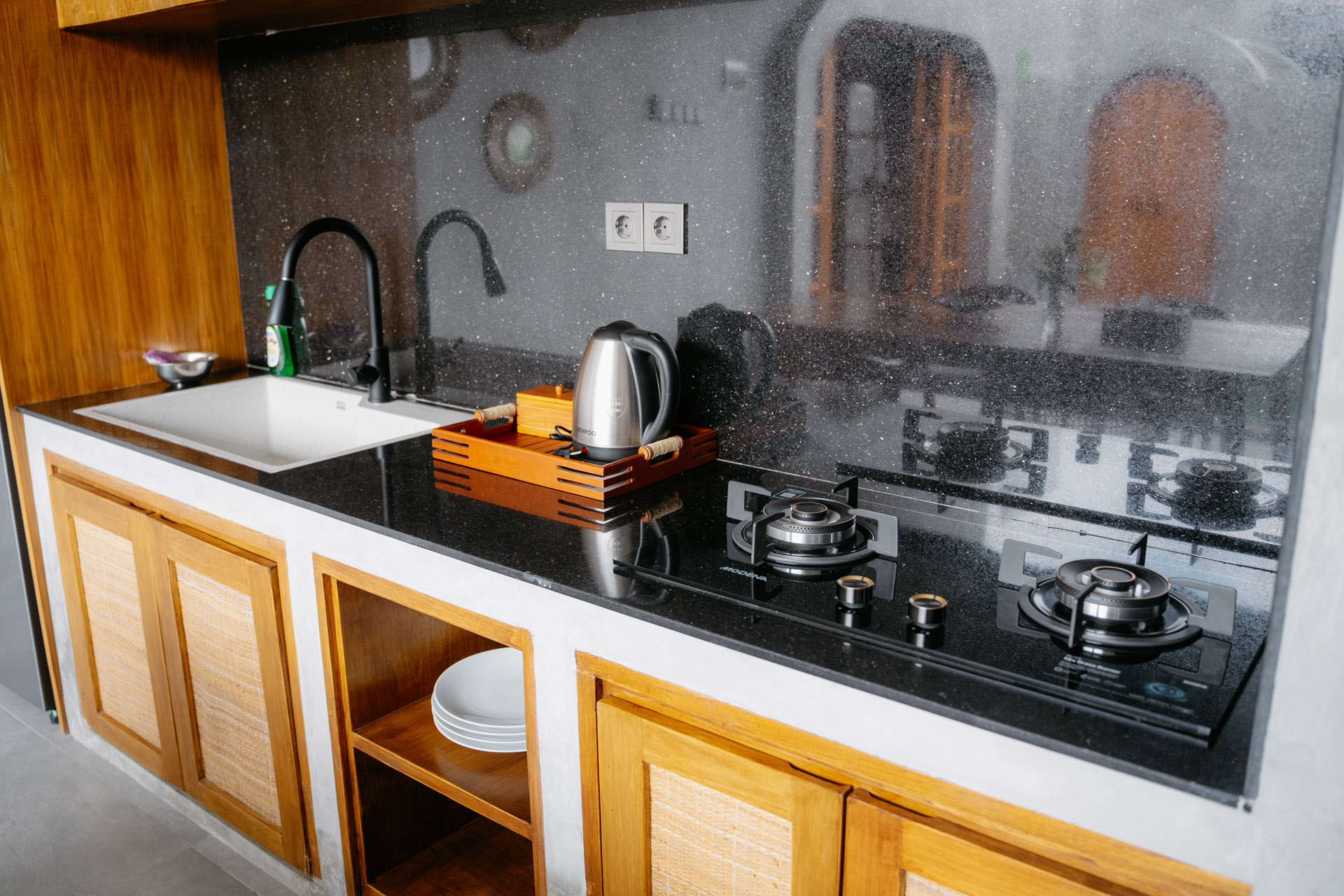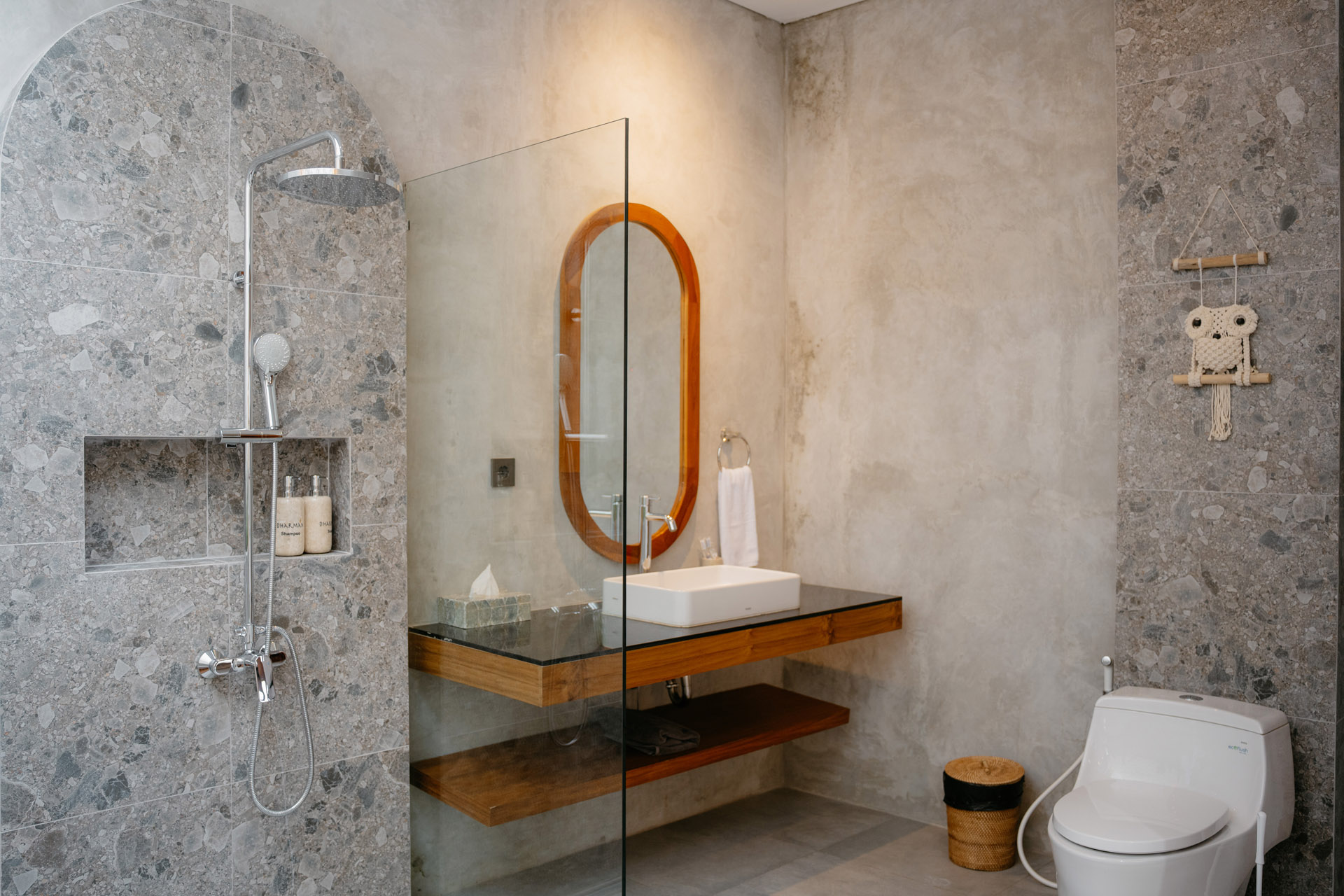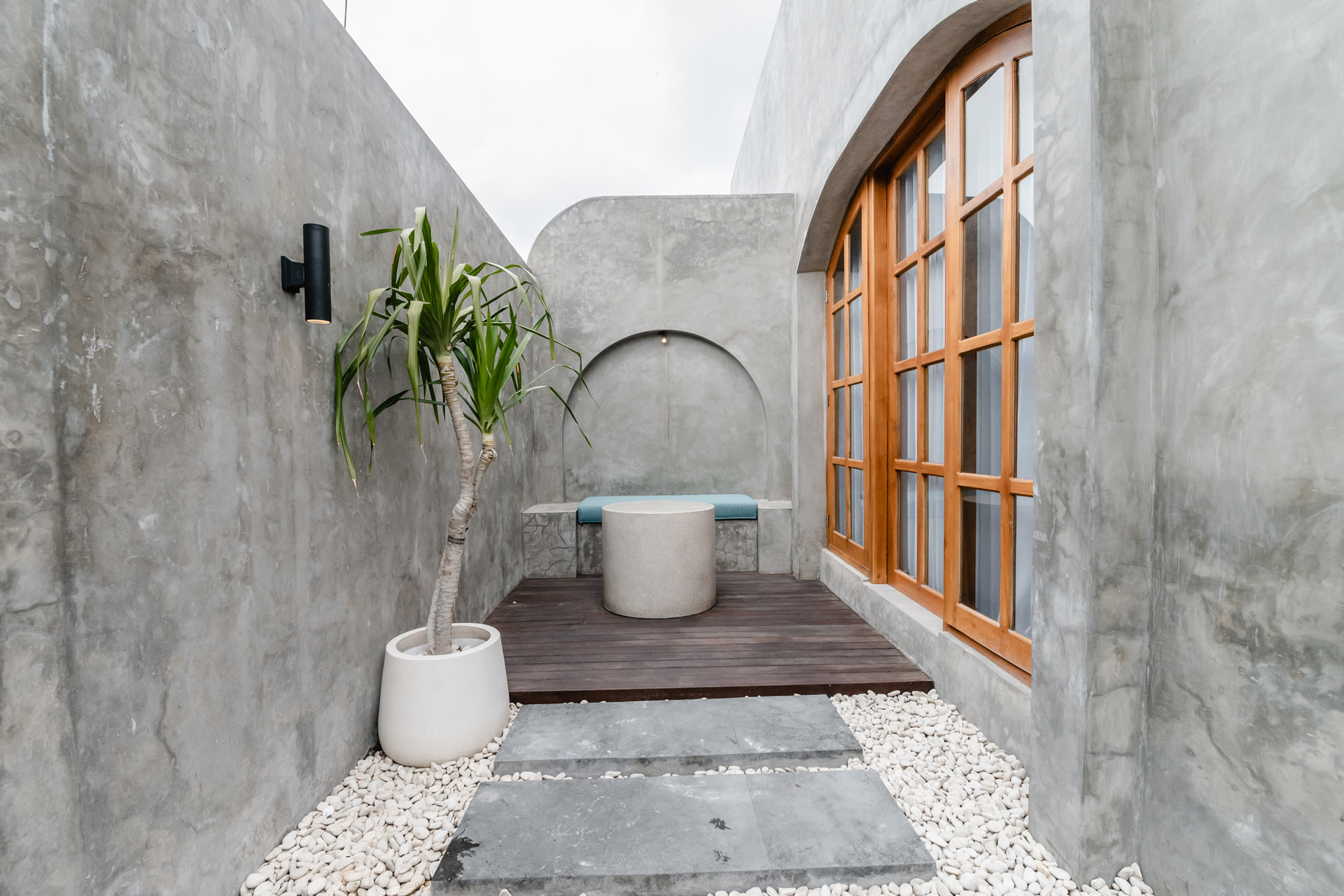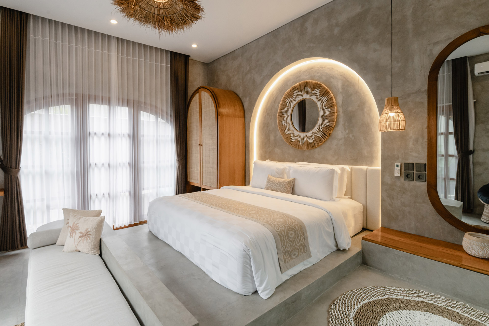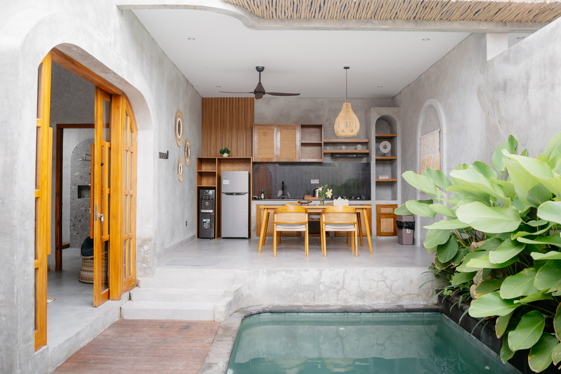 a thoughtfully designed space featuring six 1-bedroom villas, one 3-bedroom villa and four deluxe studio rooms . Built with a unique Tropical Industrial Boho style, the architecture blends raw concrete elements with warm tropical tones, lush greenery, and natural materials. Each villa is infused with Bali’s signature open-air living concept—complete with open kitchens & abundant natural light.