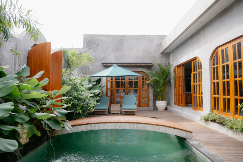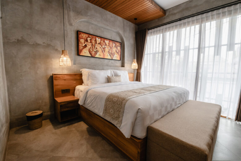 a thoughtfully designed space featuring six 1-bedroom villas, one 3-bedroom villa and four deluxe studio rooms . Built with a unique Tropical Industrial Boho style, the architecture blends raw concrete elements with warm tropical tones, lush greenery, and natural materials. Each villa is infused with Bali’s signature open-air living concept—complete with open kitchens & abundant natural light.