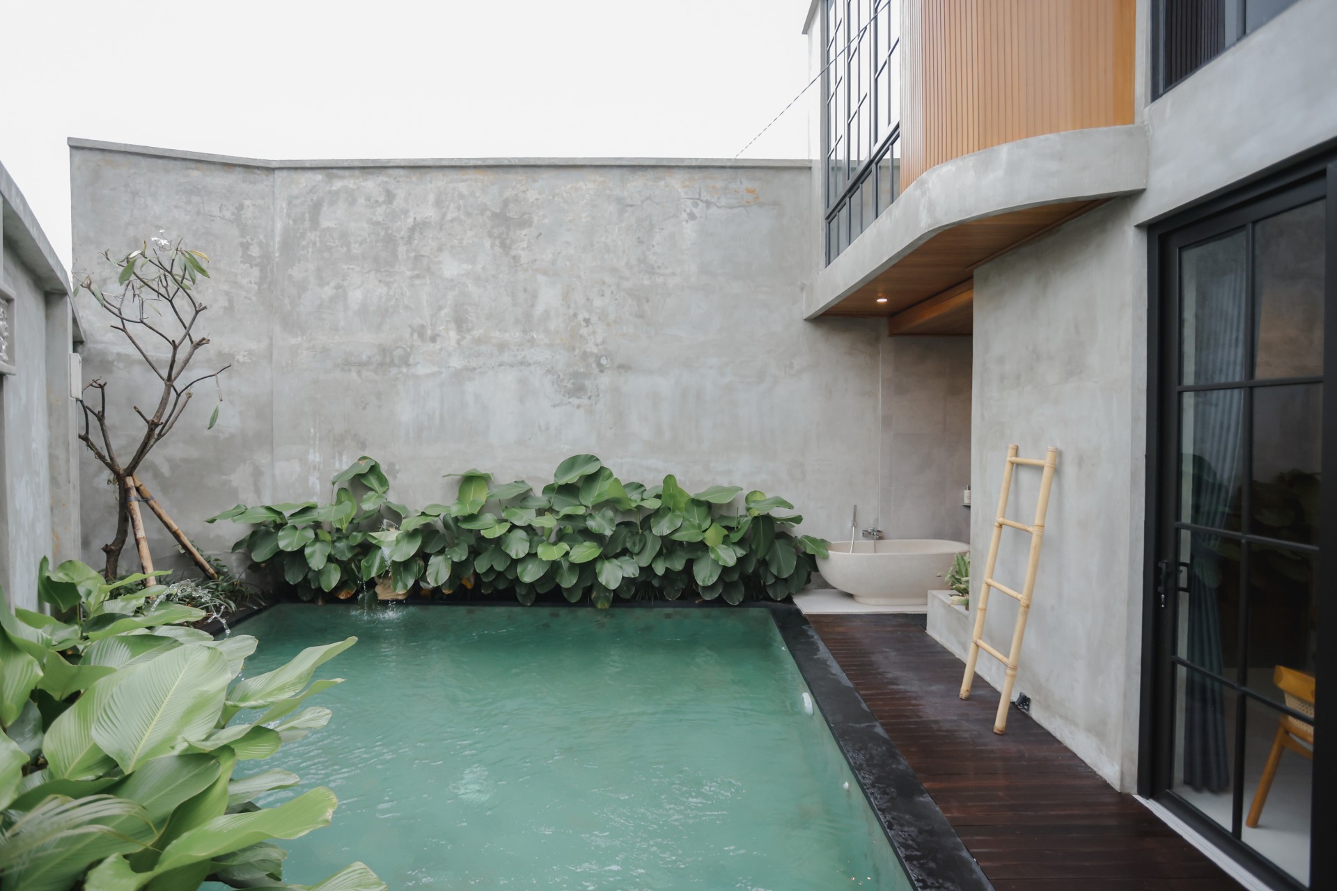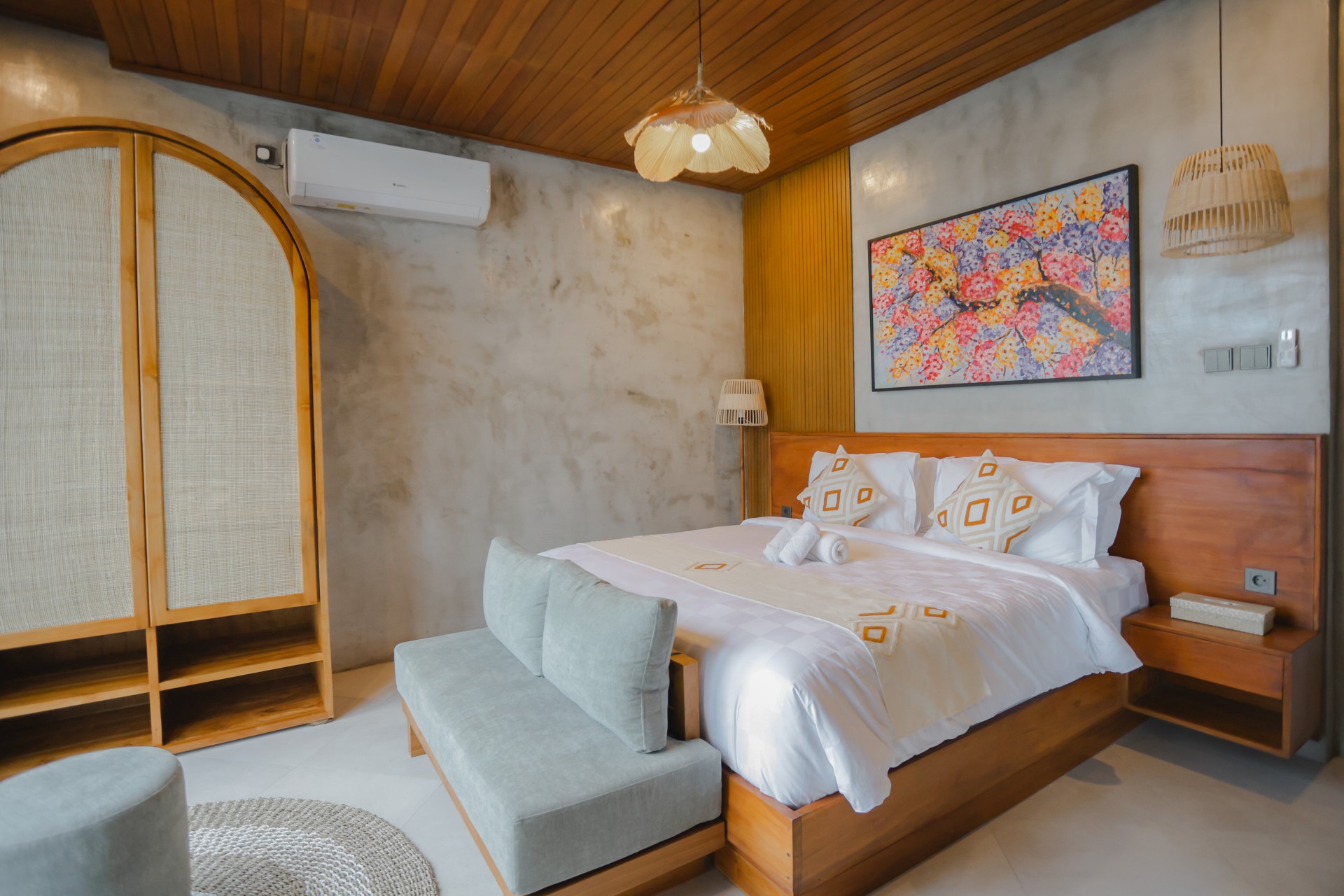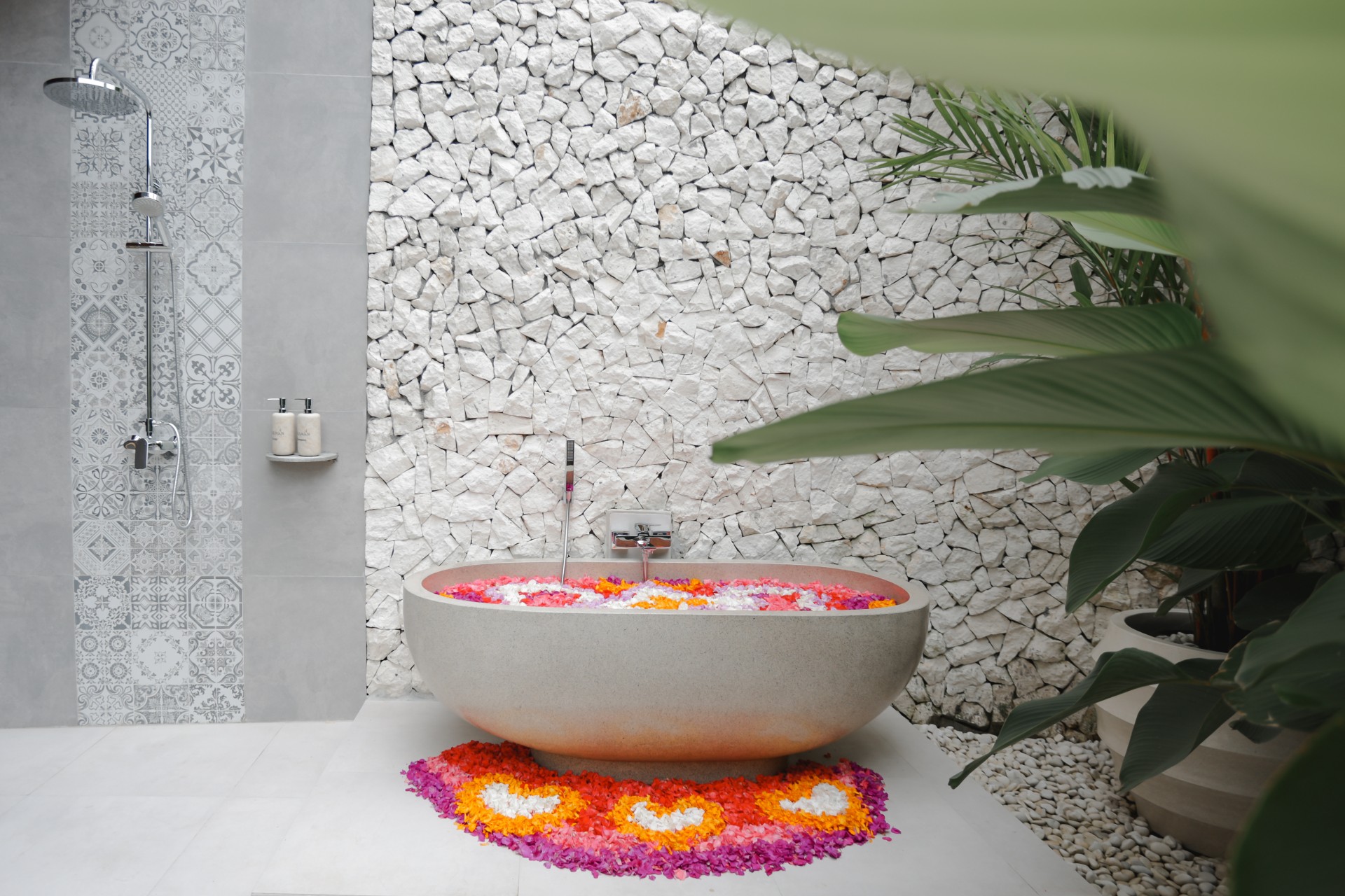 The private pool area is designed for relaxation, surrounded by greenery and a contemporary outdoor layout. The bathroom blends natural stone elements with modern fittings, offering both a rain shower and a statement bathtub, perfect for a refreshing soak. With its thoughtful facilities, cozy, and convenient location near Canggu’s cafés, beaches, and lifestyle destinations. Pentagon Villa provide the ideal balance of comfort, privacy, and accessibility for your Bali getaway.