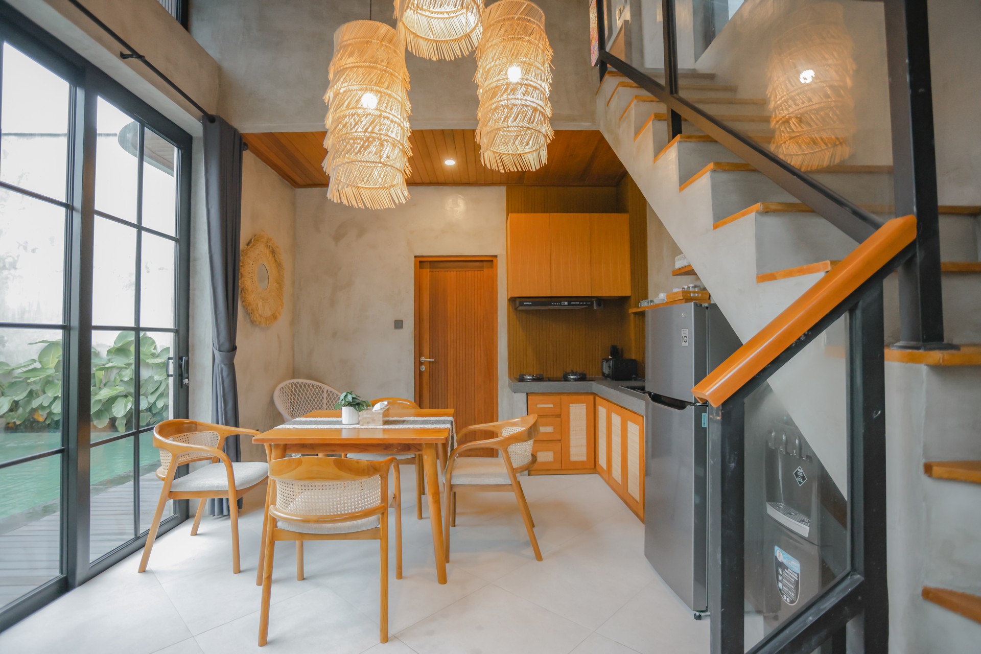 Pentagon Villa are stylish one-bedroom private villas located on North Kuta, Badung. Each villa offers one bedroom, one bathroom, and a private pool, creating an intimate space perfect for couples or solo travelers. The interiors combine modern design with warm wooden details, featuring an open-plan living and dining area, a fully equipped kitchen, and comfortable furnishings. Large windows allow natural light to flow in, creating a bright and welcoming ambiance throughout the villa.